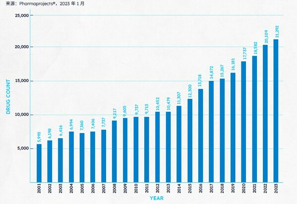 过去三年,新冠疫情影响下制药行业的动荡逐步平息,全球研发开始步入稳定增长的阶段。据Pharmaprojects® 2023年1月数据显示,2023年全球管线总规模再创新高,全球药品及疫苗数量共计21292个,较去年上涨5.89%。