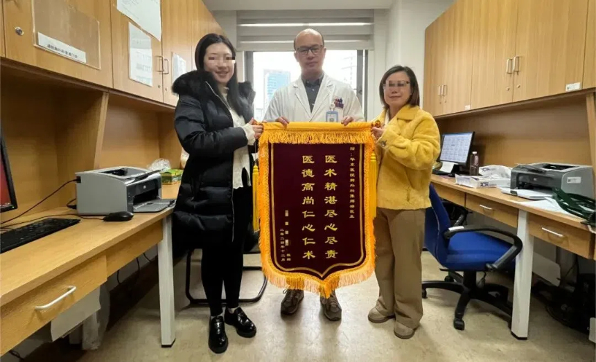 为感谢复旦大学附属华东医院这次紧急、重要的救治,秦先生托家属特意送来感谢信和锦旗,激动表示:“张医生及贵院胸外科所有医护人员的辛勤付出和无私奉献,让我转危为安,十分感动,由衷感谢,也祝愿张医生在未来的医疗事业中继续发光发热,为更多患者带去健康与光明。”