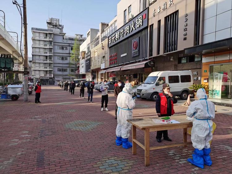 4月4日全市大筛查。队员李小凤临时接替其他队员,独自一人在东江湾路附近小区为居民们采样。社区志愿者配合扫码,队员一人负责采样、贴条码、统计、收集转交标本、医废收纳等等,一气呵成顺利完成了采样任务。