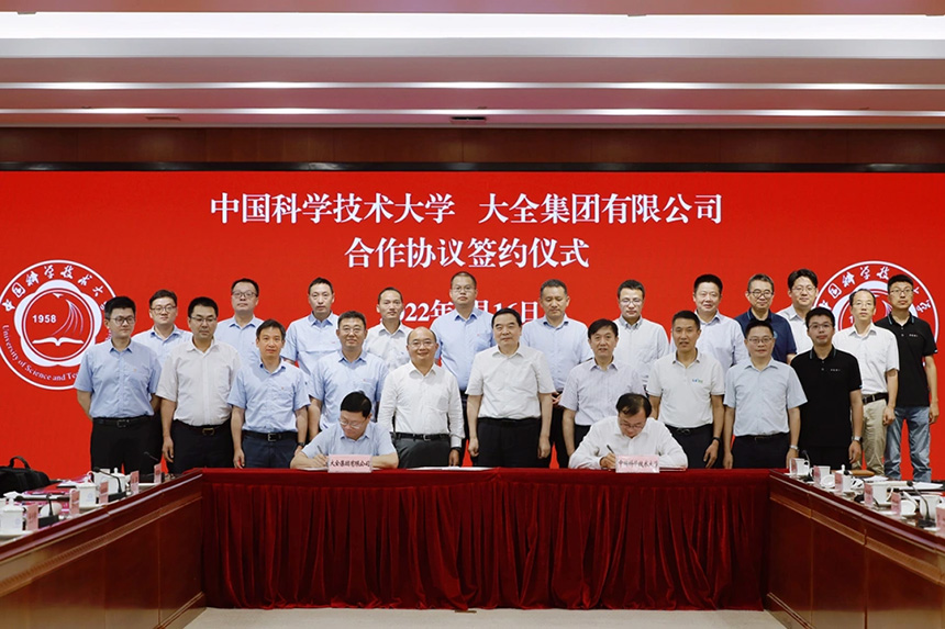 中国科技大学校长、中国科学院院士包信和,中国科技大学党委副书记傅尧;大全集团总裁徐翔、执行总裁葛飞、总工程师张步林等领导参加签约仪式。