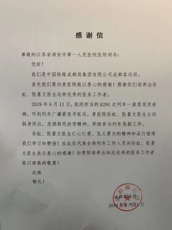 (中国铁路成都局集团有限公司成都客运段感谢信)