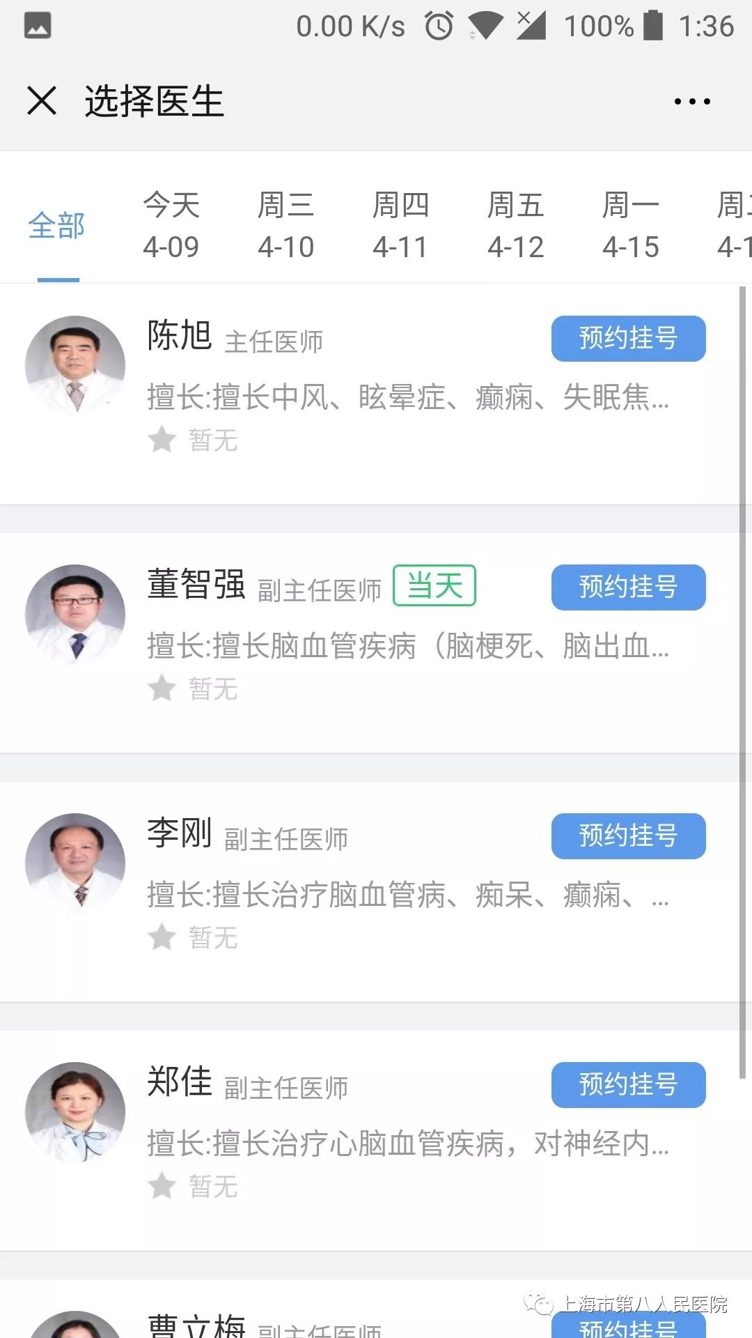点击在线预约,进入上海八院科室列表,选择科室